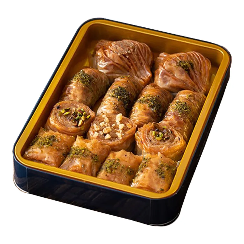 يتم إنتاج علب البقلاوة بأحجام المذكورة أعلاه أو بأحجام مخصصة باستخدام الورق المقوي الصحي بوزن 300 إلى 350 جرام، سواء مع طباعة أو بدون طباعة، أو مع قاعدة مغلفة بالسلفون.